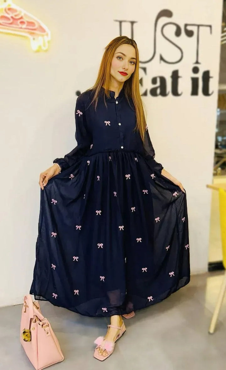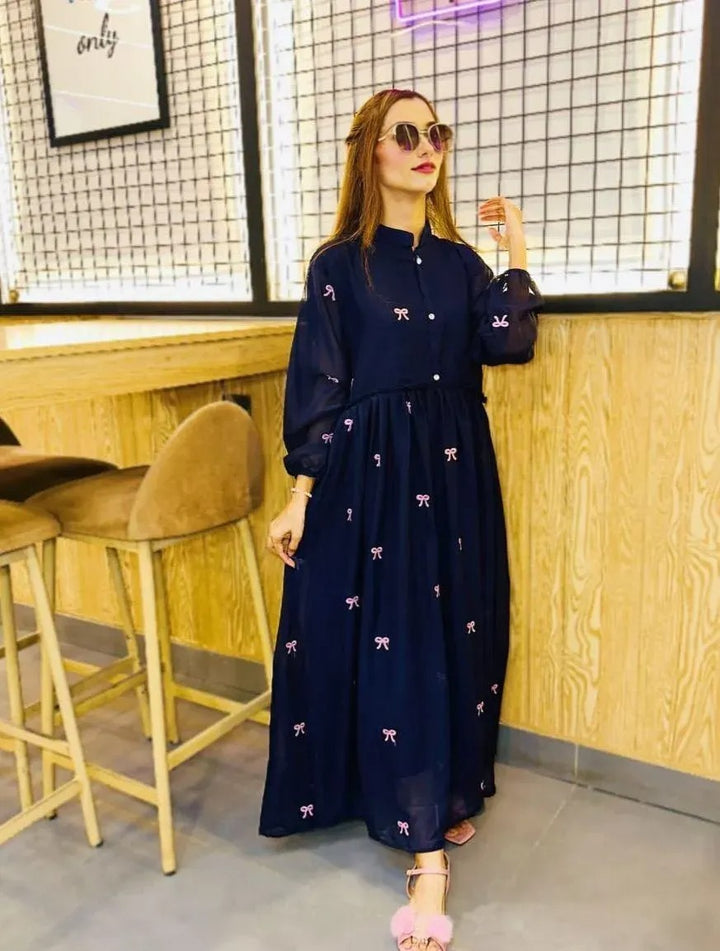 1 Pc Women's Stitched Chiffon Embroidered Maxi – Blue