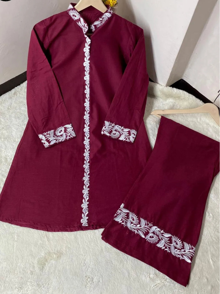 2 Pcs Women's Stitched Cotton Embroidered Shirt and Trouser – Maroon