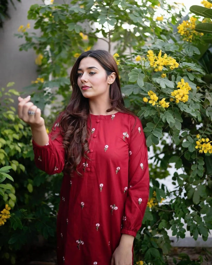 Refresh your wardrobe with this elegant 2-piece stitched embroidered shirt and trouser set crafted from premium linen fabric. Designed with a round neck embroidered shirt and matching embroidered trousers, this outfit is perfect for everyday wear while keeping you stylish and comfortable. Available in Small, Medium, Large, and X-Large sizes, it’s a versatile choice for casual outings or relaxed gatherings. Package includes 1 x Shirt and 1 x Trouser in a bold red color.