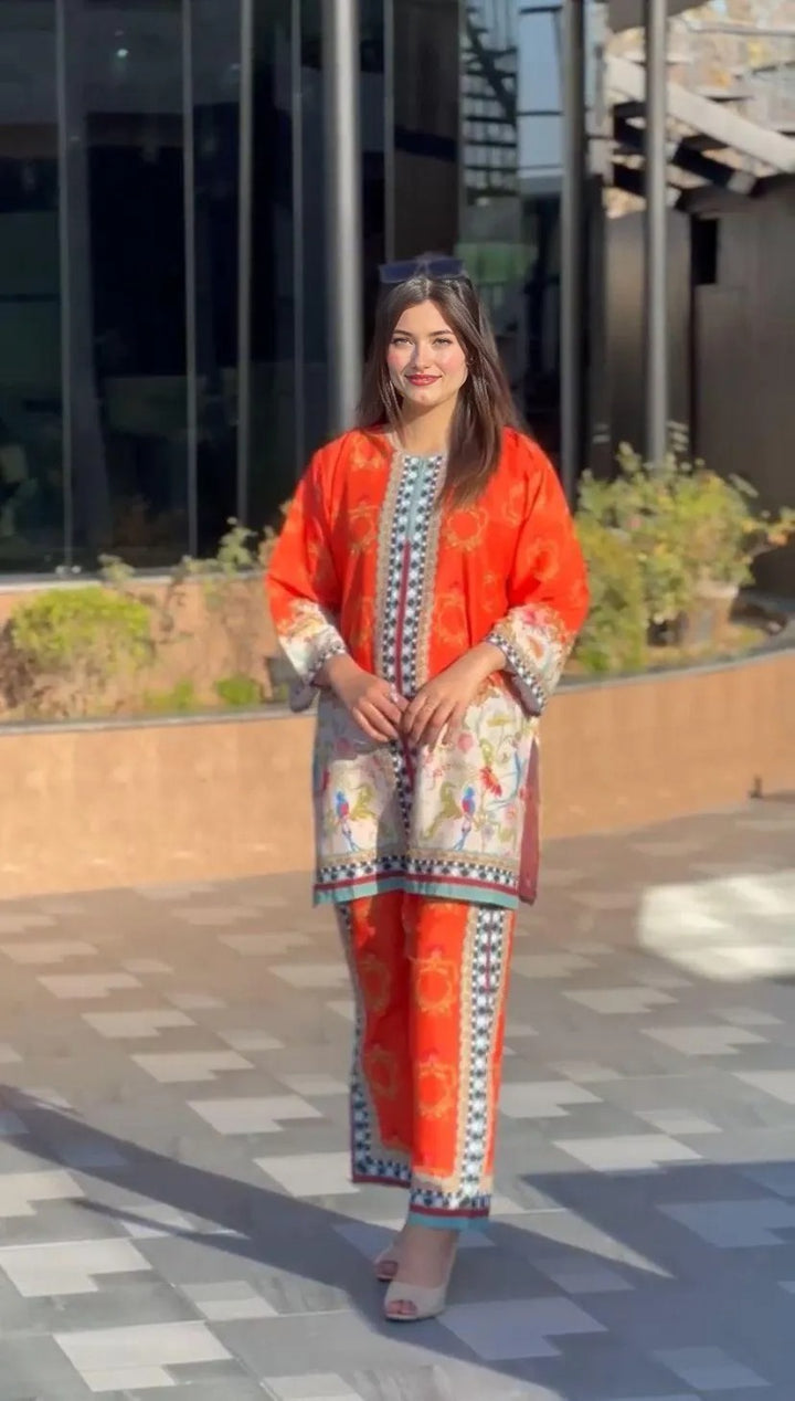 Upgrade your wardrobe with this PISTA Collection 2-piece stitched Swiss Lawn printed co-ord set, featuring a chic orange patti design. Crafted from premium Swiss Lawn with a soft crape feel, this outfit is perfect for everyday wear and casual outings. The round-neck printed shirt pairs beautifully with matching printed trousers, giving a trendy and graceful look. Available in Medium and Large sizes, the set ensures comfort with its elastic waist trousers and stylish fit. Each pack includes 1 shirt and 1 trouser, making it a versatile and fashionable new arrival in your collection.