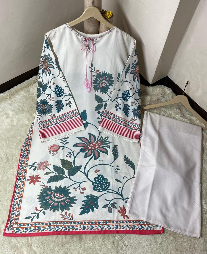Step out in effortless style with this 2-piece co-ord set, featuring a beautifully printed Swiss voile shirt paired with plain Swiss lawn trousers. Designed in a graceful white shade, the shirt comes with a 38-inch length and 21-inch chest, while the trousers offer a 40-inch length for a comfortable fit. Perfect for everyday elegance or semi-formal gatherings, this versatile outfit ensures both comfort and sophistication. Available in standard size, the package includes 1 x Shirt and 1 x Trouser.