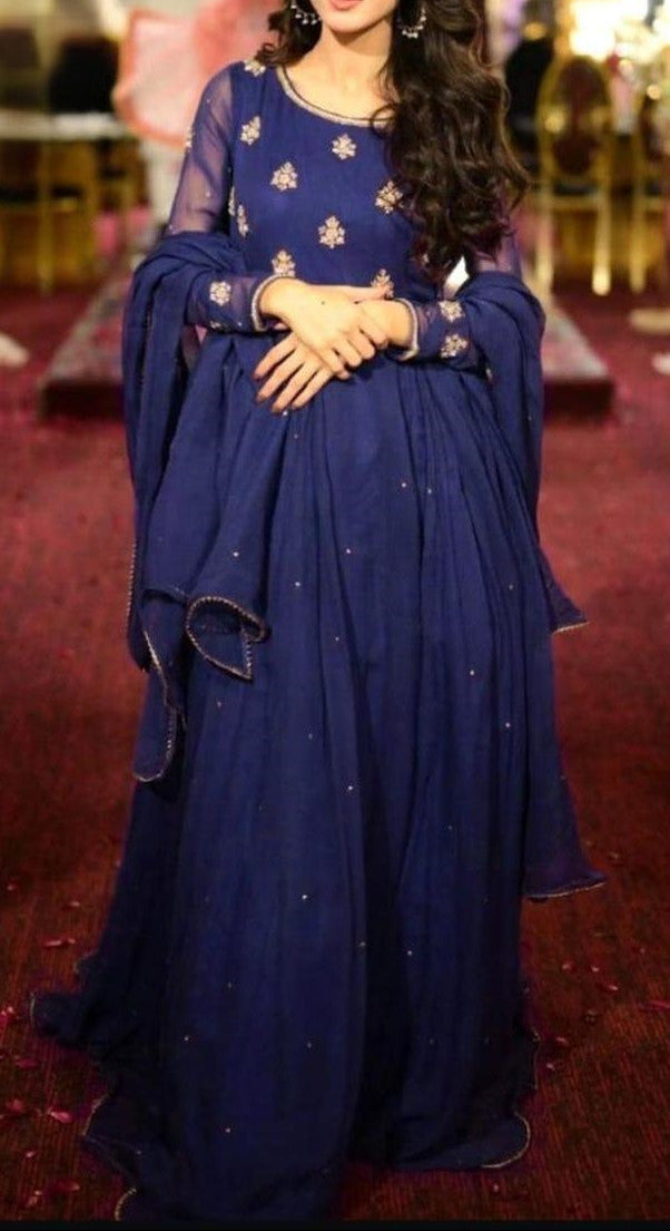 Step into elegance with this Women’s Stitched Chiffon Embroidered Maxi Suit, beautifully designed with embroidered neck and sleeves, delicate lace accents, and pearl embellishments on the front and back. Crafted from premium chiffon with an attached malai crepe inner, the maxi offers both style and comfort, featuring a length of 53–54 inches, a 20–21 inch chest, and a graceful 100-inch flare. Paired with a 38-inch malai crepe trouser and a chiffon dupatta measuring 2.25 yards, detailed with four-sided lace and pearls, this 3-piece outfit is a perfect choice for festive occasions, weddings, or formal gatherings. The timeless blue hue and intricate detailing ensure a sophisticated look that stands out effortlessly. Package includes 1 maxi, 1 trouser, and 1 dupatta.