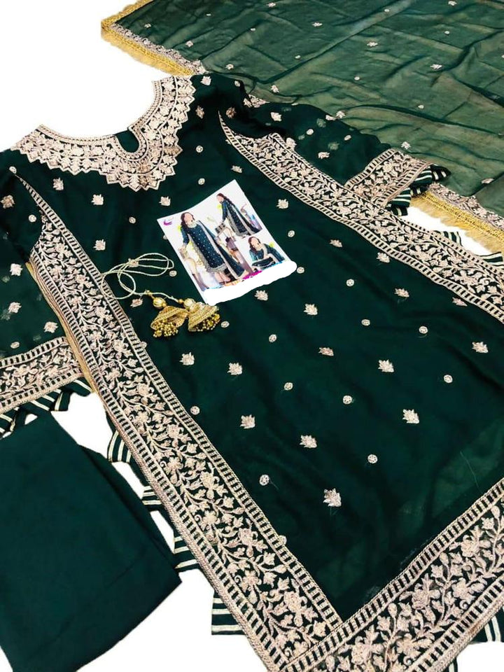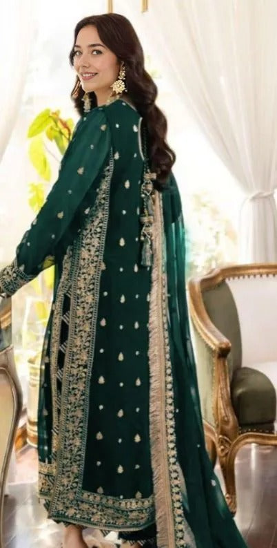 Enhance your wardrobe with this elegant 3-piece chiffon embroidered suit, designed with a round-neck embroidered shirt, plain trouser, and a delicately embroidered chiffon dupatta. Available in Medium and X-Large sizes, the medium shirt measures 39 inches in length with a 20-inch chest and 37-inch trouser, while the X-Large shirt has 39 inch length and 23-inch chest with a 38-inch trouser. The 2.5 gazz embroidered dupatta completes the look, making this stunning green outfit perfect for festive occasions or graceful evening wear.