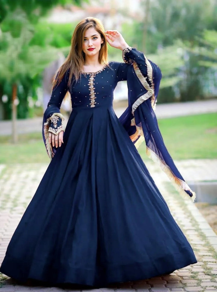 Step into elegance with this stunning blue embroidered chiffon maxi suit, a 3-piece ensemble designed for festive and formal occasions. The long embroidered maxi features intricate kaya work on the neck and sleeves, paired with a crepe trouser and a chiffon dupatta adorned with four-side lace work. Crafted from pure chiffon with an attached inner, this outfit offers both luxury and comfort. With a graceful 100-inch flare, standard size fit, and fine finishing, this attire is perfect for weddings, parties, or traditional gatherings. A complete ready-to-wear set that blends sophistication with timeless charm.
