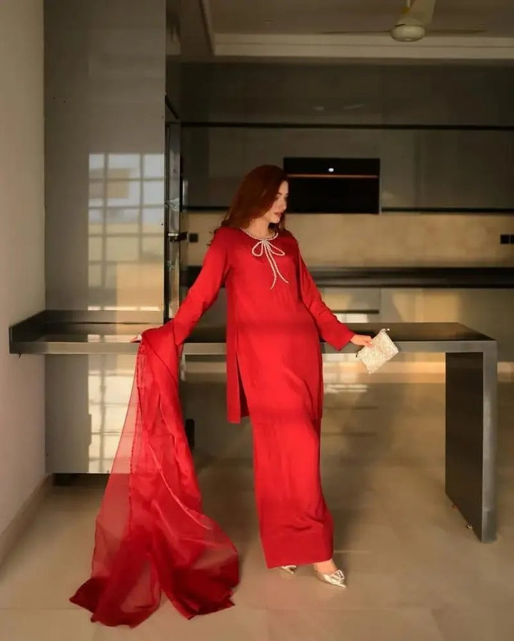 Turn heads with this trending Farshi Shalwar Suit, crafted from luxurious Shamoz Silk and featuring a sparkling rhinestone bow neck with delicate lace work. Paired with a lightweight silk organza dupatta and plain trousers, this 3-piece maroon ensemble is perfect for weddings, mehndi, and festive events. Available in Small, Medium, and Large sizes, it offers both comfort and elegance for every occasion. The package includes 1 x Shirt, 1 x Trouser, and 1 x Dupatta.
