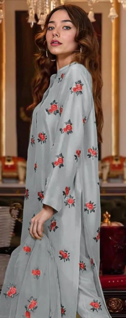 This graceful 3-piece women’s stitched suit is crafted from premium Shamoz Silk and styled with a round neck, delicate rose embroidery on the shirt, a plain Shamoz Silk trouser, and an embroidered organza dupatta. Designed in a standard size, the shirt measures 37–38 inches in length with a 21-inch chest, 15-inch shoulder, and 11-inch arm length, while the trouser comes in 37–38 inches length with a 20-inch waist and 23-inch hip for a flattering fit. The set includes 1 shirt, 1 trouser, and 1 dupatta, with the dupatta measuring 2.5 yards and finished in soft organza with embroidery. Presented in an elegant grey shade, this outfit combines quality stitching, fine detailing, and comfort, making it a perfect choice for both casual and semi-formal occasions.