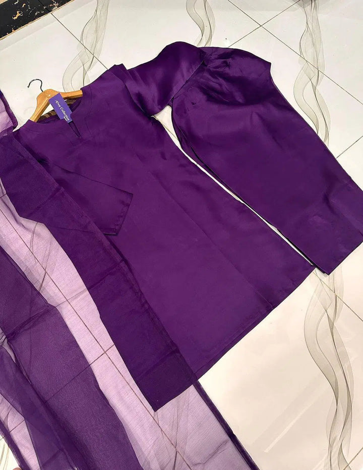 Elevate your style with this luxurious 3-piece women’s stitched suit in premium silk. The set features a V-neck plain shirt with long flare, a 3-yard original Farshi shalwar with graceful ghair, and a 2.5-yard organza dupatta. Designed in a rich purple color, the shirt measures 37" in length with a 21" chest, while the shalwar is 37" long for a flattering flow. Perfect for formal and festive occasions.
