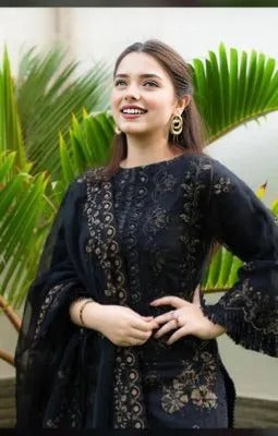 Redefine your style with this luxurious unstitched embroidered suit . Crafted from premium lawn fabric with a beautifully embroidered bamber dupatta, this elegant black 3-piece set is the perfect blend of sophistication and tradition. The 3 gazz cutting gives you the freedom to stitch it in your own unique style – wear it your way and stand out effortlessly