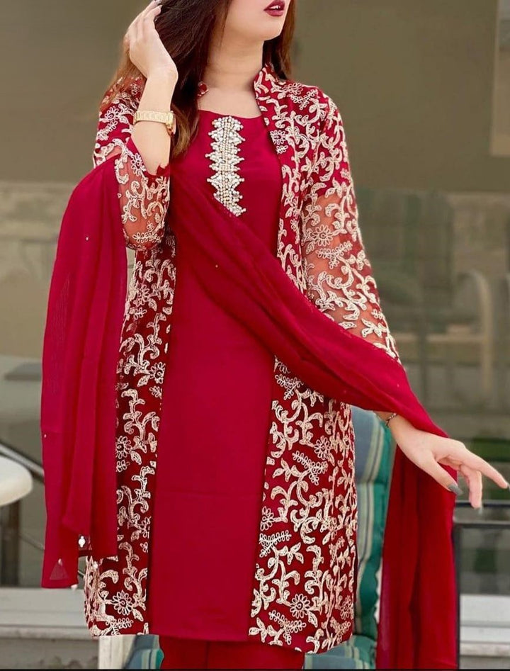 This stunning 4-piece women’s stitched gown suit is beautifully crafted from luxurious Shamoz Silk and styled in a rich maroon shade, featuring a U-neck embroidered shirt, a plain Shamoz Silk trouser, an elegant embroidered gown, and a plain chiffon dupatta. Designed for a standard size fit, the shirt measures 36 inches in length with a 21-inch chest, 15-inch shoulder, and 11-inch arm length, while the embroidered gown measures 40–41 inches in length with a 21–22 inch chest and 15-inch shoulder, adding a regal touch with its organza fabric. The trouser is 38–39 inches long with a 20-inch waist and 23-inch hip, tailored from Shamoz Silk for comfort and flow, and the plain chiffon dupatta comes in 2.5 yards length for a graceful finish. With fine embroidery, premium fabrics, and quality stitching, this ensemble blends elegance and sophistication, making it the perfect choice for festive occasions or semi-formal gatherings.