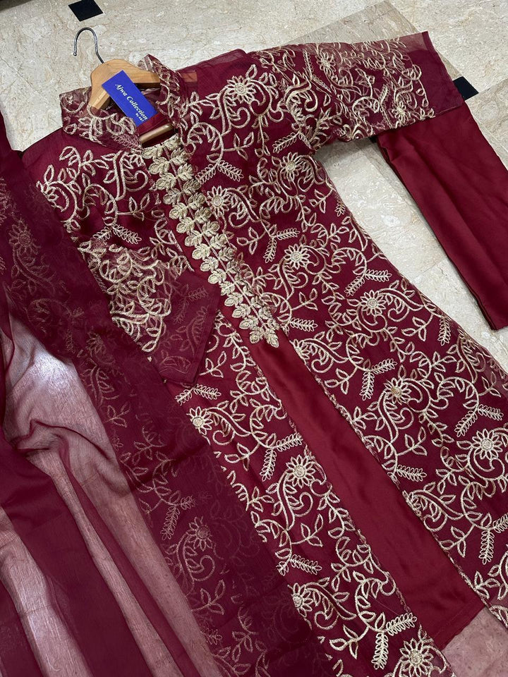 Elegant Maroon 4 Pcs Women's Stitched Gown Suit in Shamoz Silk with Embroidered Design