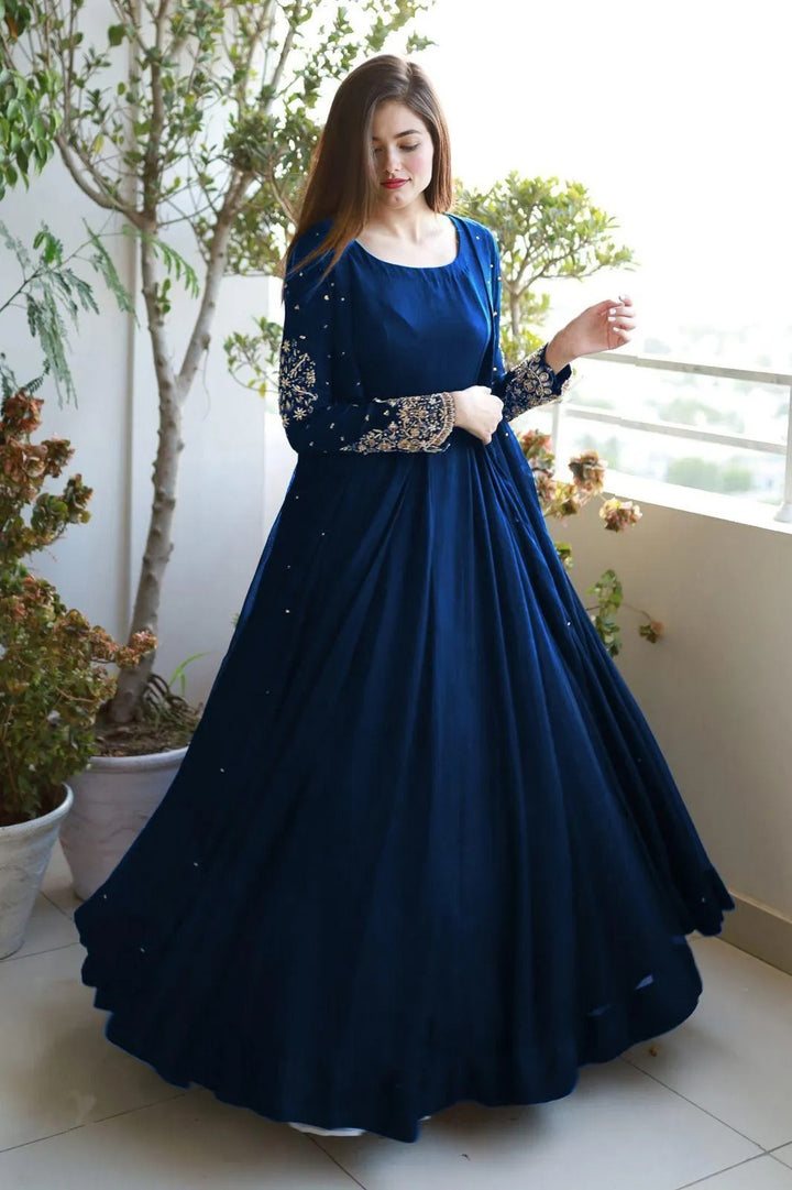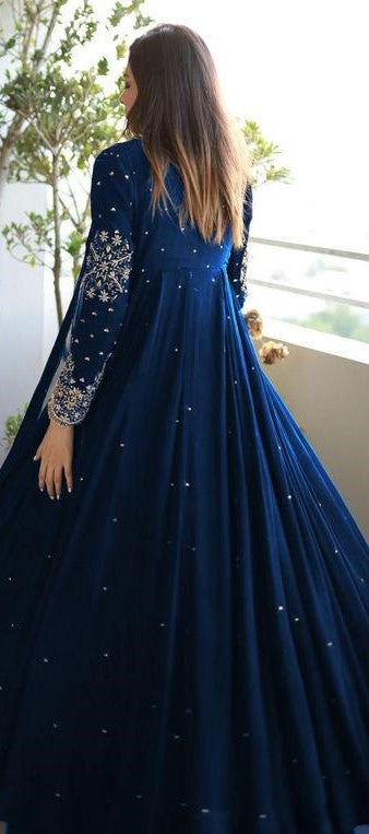 Elevate your ethnic wardrobe with this stunning navy blue embroidered maxi set, crafted from luxurious shamoz silk. This 3-piece stitched ensemble includes a beautifully embroidered gown, a plain trouser, and a maxi, designed with a graceful round neck for elegance and comfort. The gown and shirt feature fine embroidery, while the trouser comes in a simple plain pattern to balance the look. Available in standard size, this navy blue set offers a perfect blend of style and tradition. With a shirt length of 54 inches, chest 20 inches, trouser length 38 inches, and gown length 54 inches with a 100 cm flare, it ensures both beauty and functionality for festive occasions or special events.