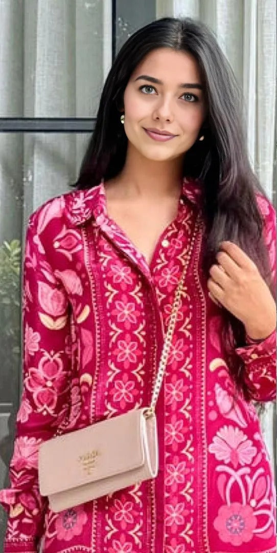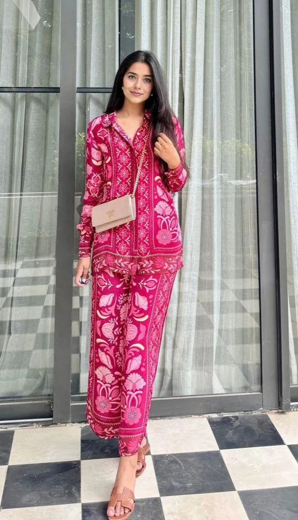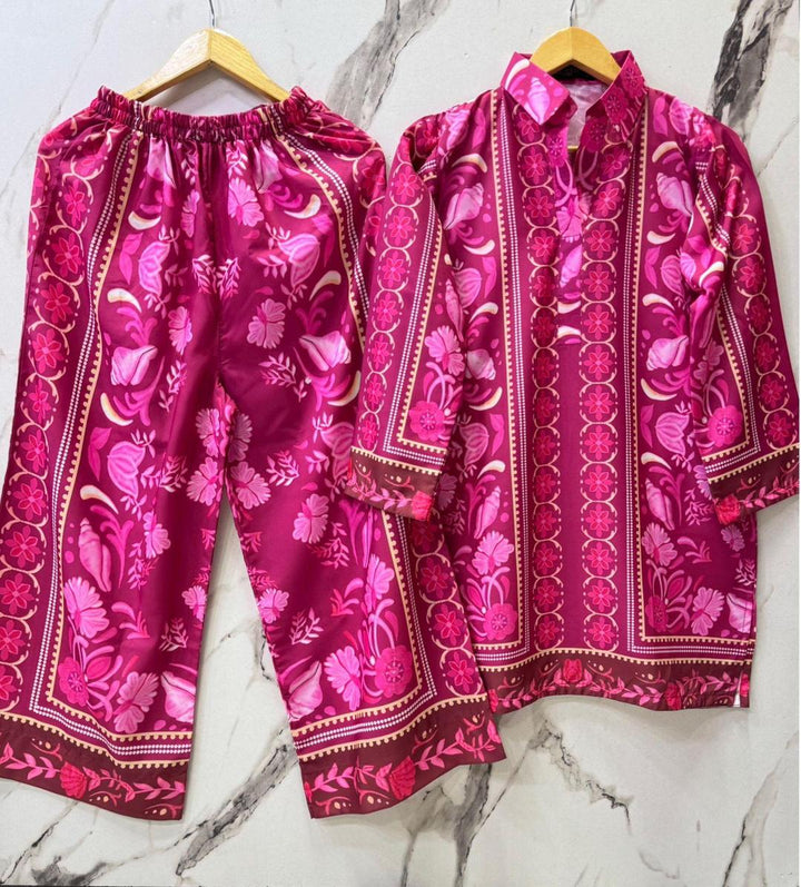 Refresh your collection with this elegant 2-piece Women's Stitched Co-Ord Set crafted from luxurious Shamoz Silk. Designed in a vibrant pink shade with digital prints, it features a collar neck shirt paired with matching trousers, combining style and comfort effortlessly. Perfect for casual gatherings or semi-formal events, this set comes with good quality stitching and full suit overlock, ensuring durability and a premium finish. Available in medium standard size, with a shirt length of 33–34 inches, chest 21–22 inches, and trouser length of 38 inches, it’s a versatile must-have in every woman’s wardrobe. Package includes 1 x Shirt and 1 x Trouser in Shamoz Silk fabric.