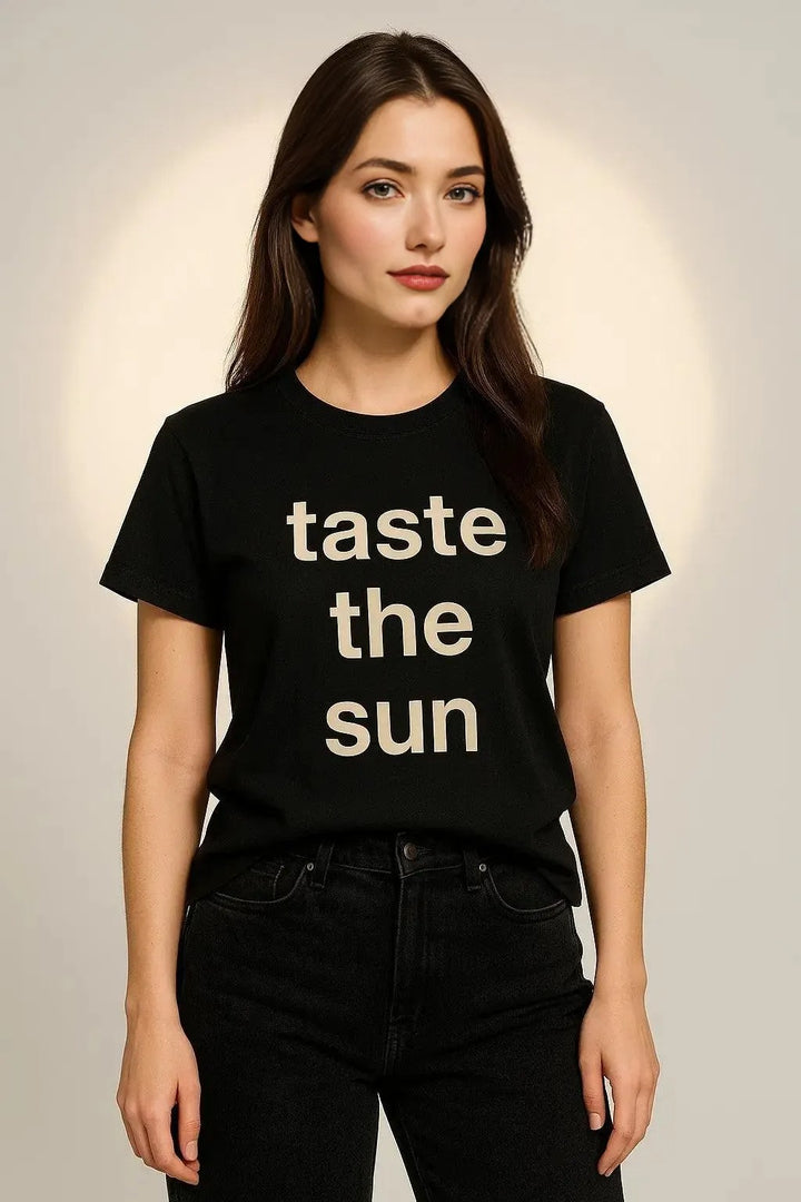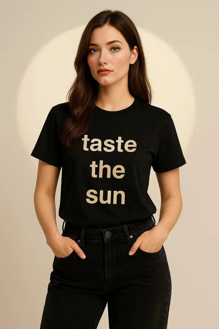 "Taste the Sun" Graphic Tee – Women's Black Cotton Statement T-Shirt